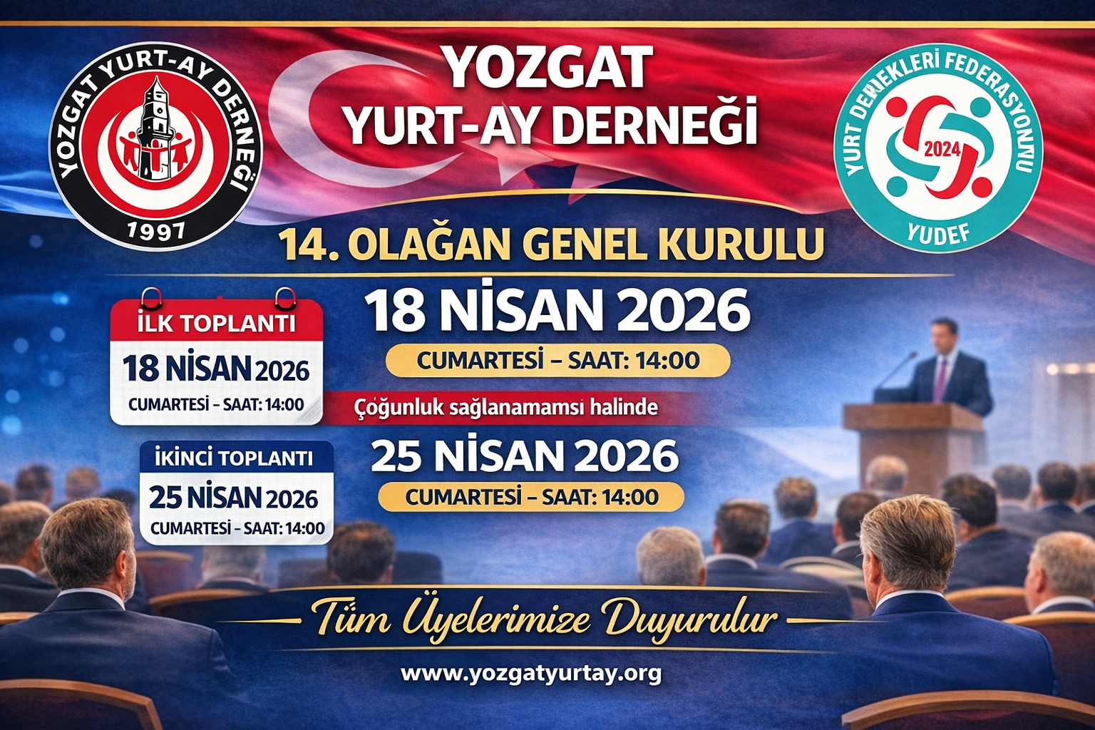 Dernek tüzüğümüz hükümleri doğrultusunda; Derneğimizin 14. Olağan Genel Kurul (Seçimli) toplantısı 18 Nisan 2026 Cumartesi günü saat 14.00’te Dernek Toplantı Salonunda gerçekleştirilecektir. İlk toplantıda yeterli çoğunluk sağlanamaması halinde ikinci toplantı, 25 Nisan 2026 Cumartesi günü saat 14.00’te aynı yer ve saatte, çoğunluk aranmaksızın yapılacaktır.